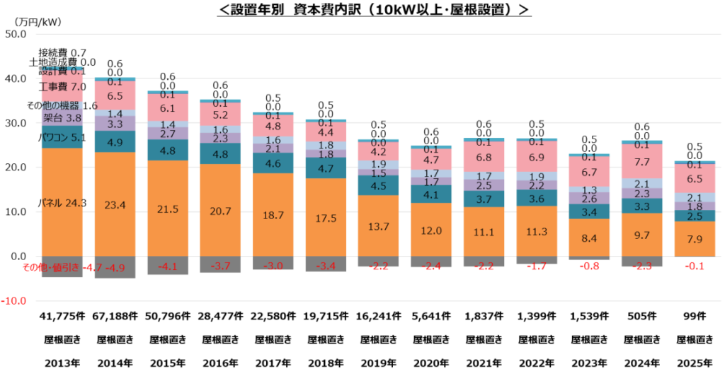 資料によると、屋根設置型太陽光の導入費用は、2025年の平均で「20.8万円/kW」となっています。2013年から調査を続けている中で、最も金額が下がっています。