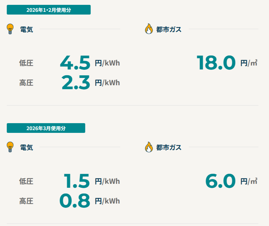 その後、エネルギー価格が落ち着きを見せたと判断され、2026年3月使用分(4月請求分)をもって終了となりました。